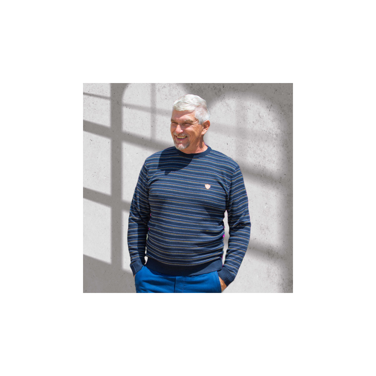 Un charme fou avec ce pull homme senior et petites rayures tricolores qui rehaussent le fond marine. iI complètera à merveille tout pantalon homme.